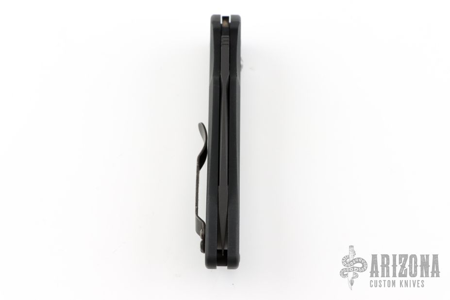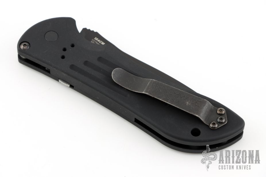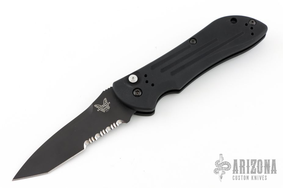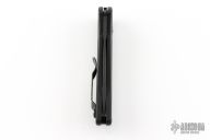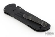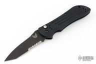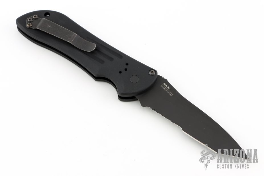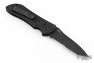 This 9101SBK AUTO Stryker from Benchmade features a black coated drop point tanto style blade with swedge, notched thumb rest and partial serrations. The handle is comprised of milled black aluminum frame with a black coated stainless steel tip up clip. Safety on backspacer and lanyard hole in pommel. Has a few light scratches otherwise the knife is in good condition.