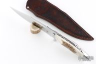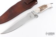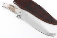 This Integral Defender Fighter Bowie Knife by Black Ore Knives features a mirror polished blade with false top edge, .216" blade stock and 1.795" blade depth, full integral construction. The handle has integral mirror polished guard and rear bolsters, fully fileworked tang, and stag scales. Comes with a hand tooled brown leather sheath. New from maker.