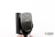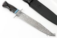 This Mosaic Damascus Big Bear Hunting Bowie by Black Ore Knives features a Spirograph Mosaic Damascus blade with false top edge, .227" blade stock and 1.754" blade depth, hidden tang construction. The handle has an engraved stainless steel guard and butt, cape buffalo horn grip with black/yellow/turquoise spacers. Comes with a hand tooled black leather sheath. New from maker.