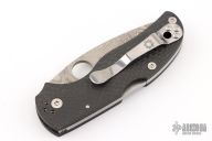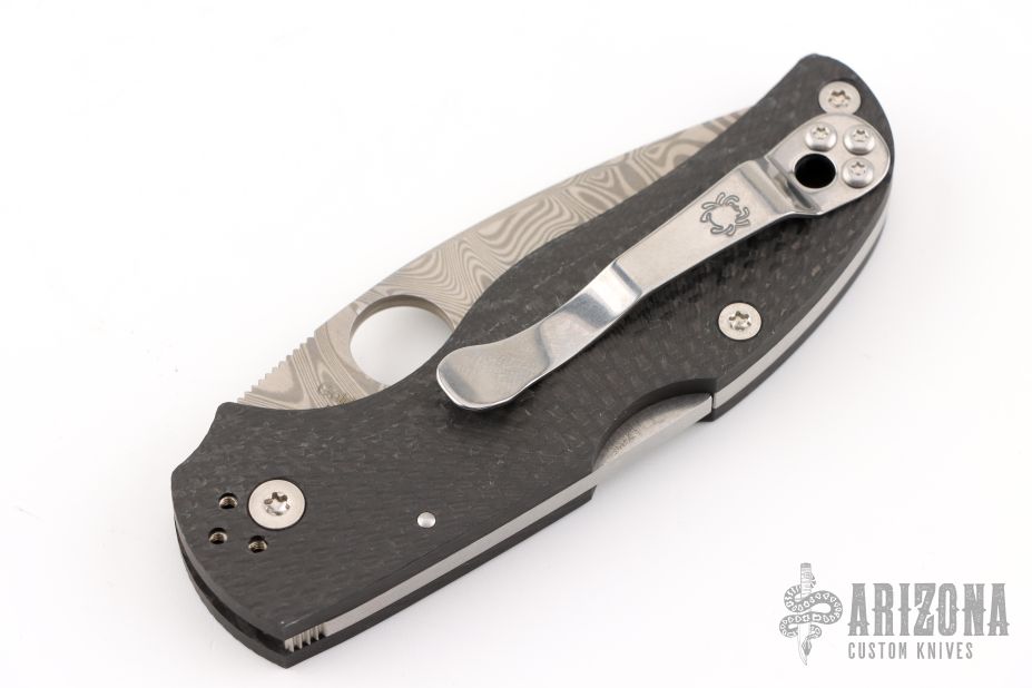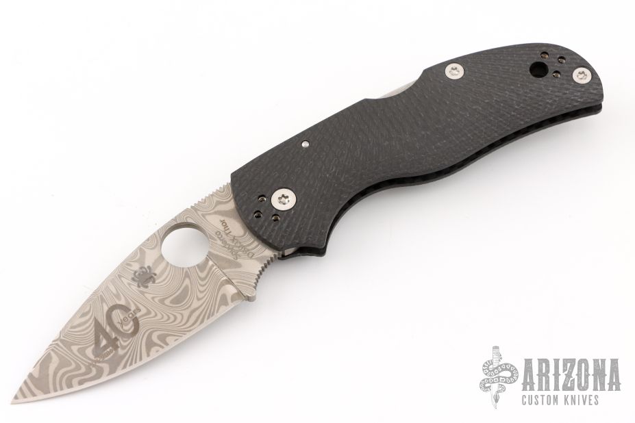 This 40th Anniversary Native by Spyderco features a Thor pattern Damasteel blade with thumbhole and notched thumbrest. The handle has a milled carbon fiber frame with a 4-way reversible stainless steel clip and stainless steel lock and backspacer. Comes with Spyderco zipper case and papers. Excellent condition.