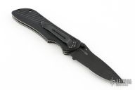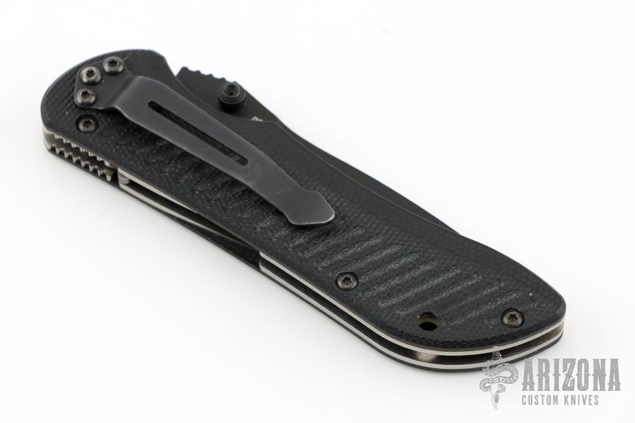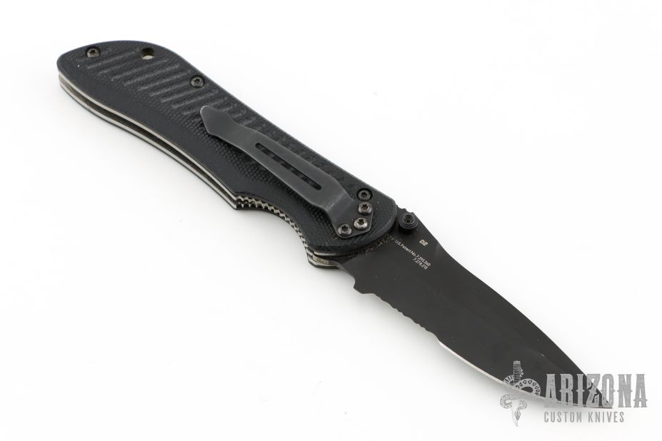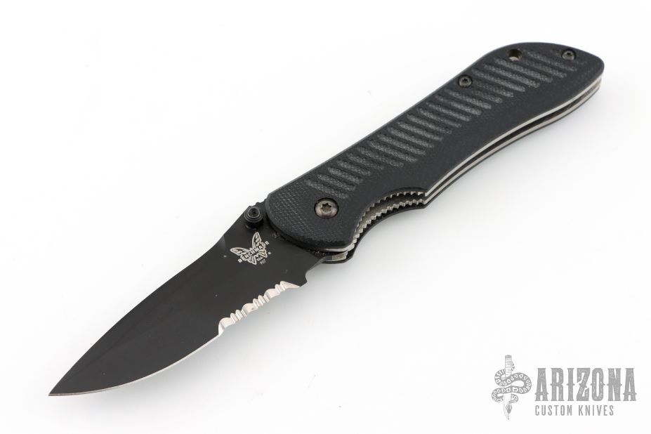 This Mini Stryker by Benchmade features a black spear point blade with partial serrations, dual thumbstuds and notched thumbrest. The handle has black G-10 scales, titanium liners, and a tip down black stainless steel clip. Comes with the original box and papers. Has some light scuffs otherwise the knife is in excellent condition.
