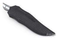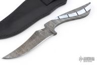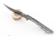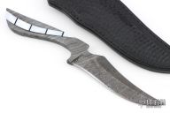 This Integral Hunter by Black Ore Knives features a Damascus blade with false top edge, .340" blade stock and 1.209" blade depth, integral construction. The handle is integral Damascus with mother of pearl and black inlays. Comes with a hand tooled black leather sheath. New from maker.