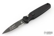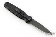 This Mini Covert Auto by Gerber features a black spear-point partially serrated blade and a notched thumbrest. Has a black aluminum handle with a and safety. Black stainless steel clip, tip down clip. Comes with original box and papers.  Excellent condition.