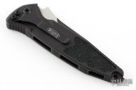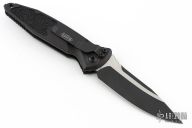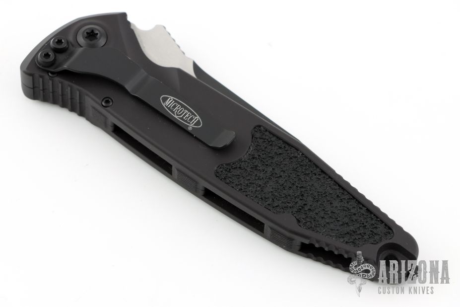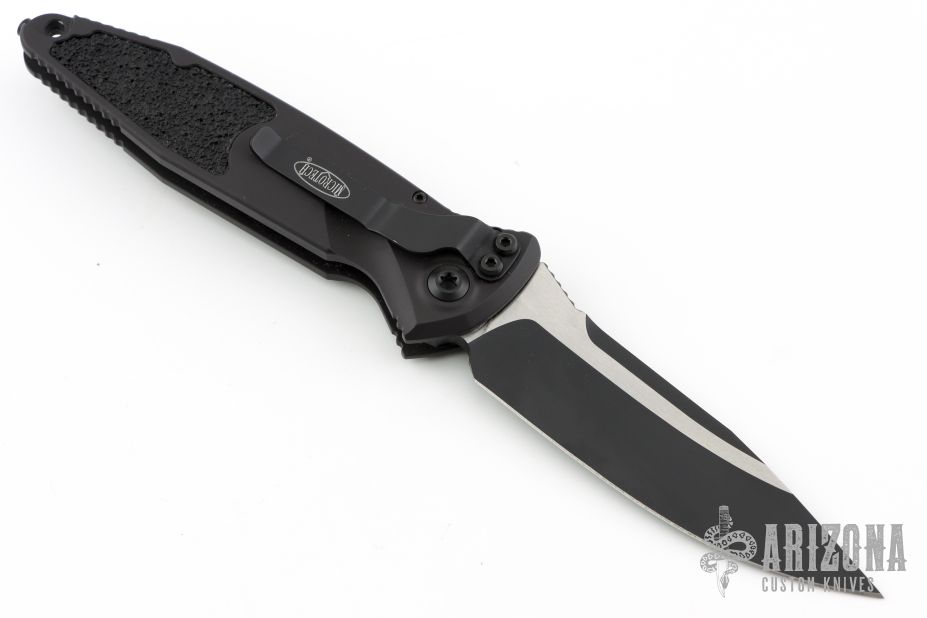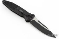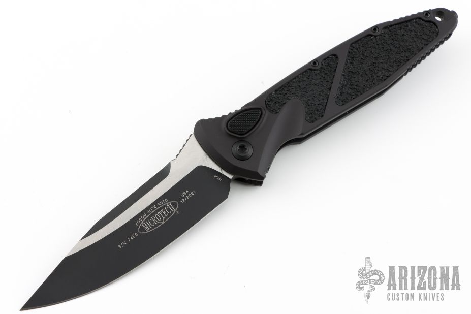 This Socom Elite Auto from Microtech has two toned drop point blade with notched thumbrest. The handle has a black aluminum frame with non-slip rubber inserts and a tip down stainless steel clip, black hardware. Dated 12/2021 and S/N 7456. Includes original box and paperwork. Excellent Condition.