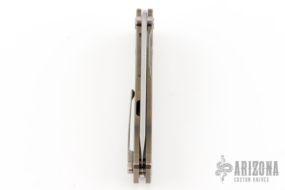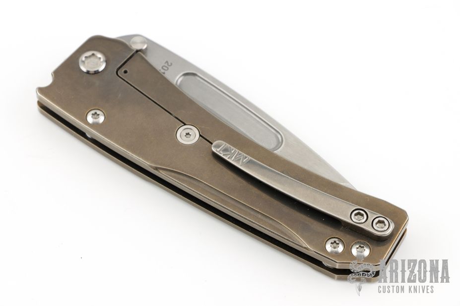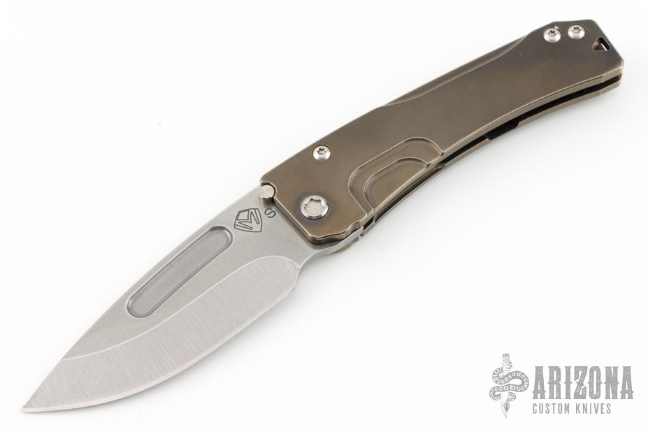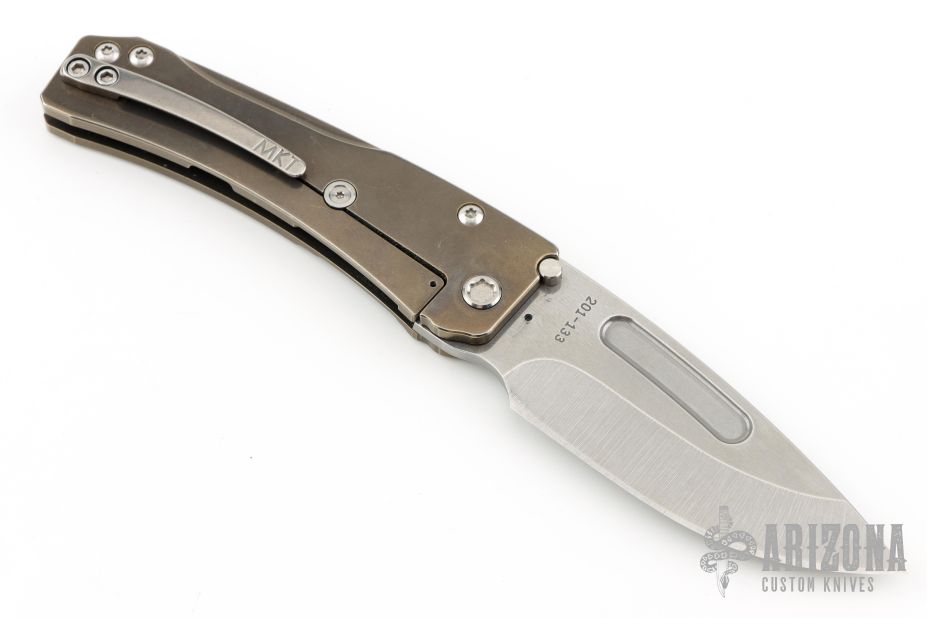 This Slim Midi Marauder from Medford Knife and Tool features a satin finished drop point blade with thumb recess. The handle is comprised of a milled, anodized, and tumbled titanium frame with stonewashed tip up clip over spacer pins with integrated lanyard hole. Excellent detent, lockup, and seating. Original hard case and papers. Excellent condition.