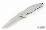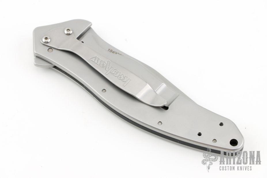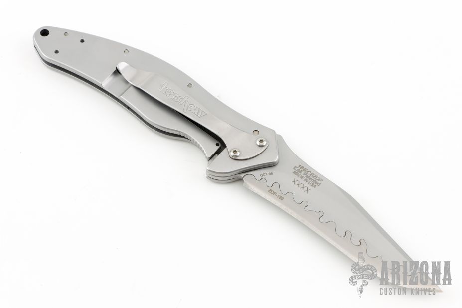 The Kershaw Shallot model 1840CBZDP is a limited edition composite blade version using 14C28N on the blade core and ZDP189 on the cutting surface. Production is only 1500 pieces of this plain edge version of the Kershaw Shallot composite blade. Has a bead blasted stainless steel handle and reversible clip. Dated Oct 06. Has a couple light scuffs, otherwise excellent condition. This one is marked "XXXX"