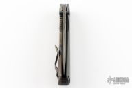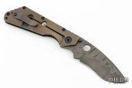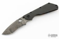 This Mick Strider custom XL framelock folder features a Nightmare Grind Damascus blade with thumbhole and "dragon spine" notched thumbrest. The handle has a satin finished anodized titanium frame with matching tip up titanium clip, smooth carbon fiber scale with lanyard hole in pommel. Notches on thumbrest, rear of handle, and lockup. Nice detent, blade seating and lockup. Comes in a Bill's custom case. Has a few scuffs, otherwise excellent condition.