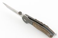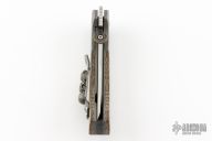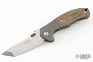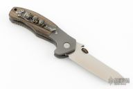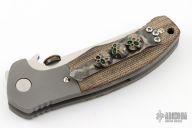 This Custom Mini Roadhouse features a chisel hand-ground tanto style satin finish blade with notched thumb ramp, and .45 Federal Auto thumb disc. The handle features bead blast titanium bolsters and liners, and green micarta scales, black G-10 backspacer. Steel Flame Three Amigos (with green eyes) clip, tip up carry. Wave feature. Smooth action with a nice detent, lockup and blade seating. Comes with original box and mommahanks knife pouch - that's it! Has a couple light scuffs, otherwise excellent condition.
