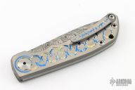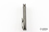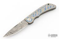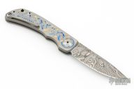 This Impinda by Chris Reeve Knives features a polished Damasteel drop point blade with nail nick. The handle has a two-tone finished frame, with satin flats, bead blasted edges, and a beautiful, unique graphic, with matching tip up clip, Damasteel spring. Comes with original box, sheath, tools, lube, and papers dated May 21, 2018. Box is signed, and says NYCKS 2018. Excellent Condition.