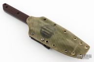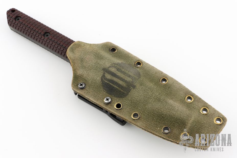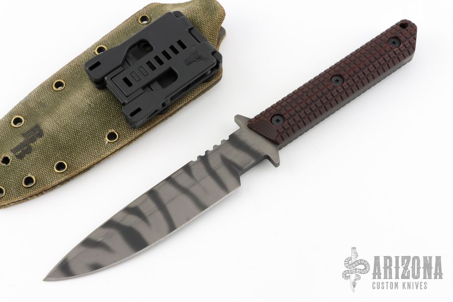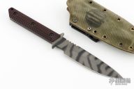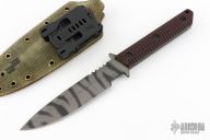 This MT Fixed Blade from Strider Knives features a tiger striped spear point blade with notched thumbrest, .192" blade stock and 1.302" blade depth. The handle is comprised of red/black G-10 scales over full tang construction with a lanyard hole. Includes Kydex sheath with clip, and Strider Velcro pouch. The knife has some light scuffs and scratches, but otherwise excellent condition.