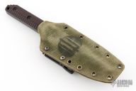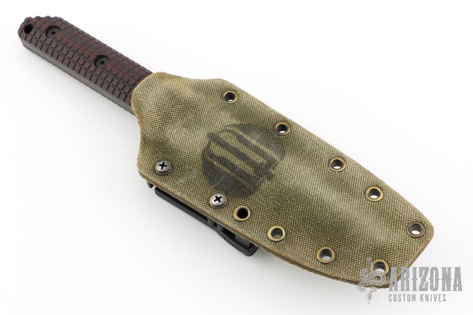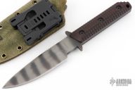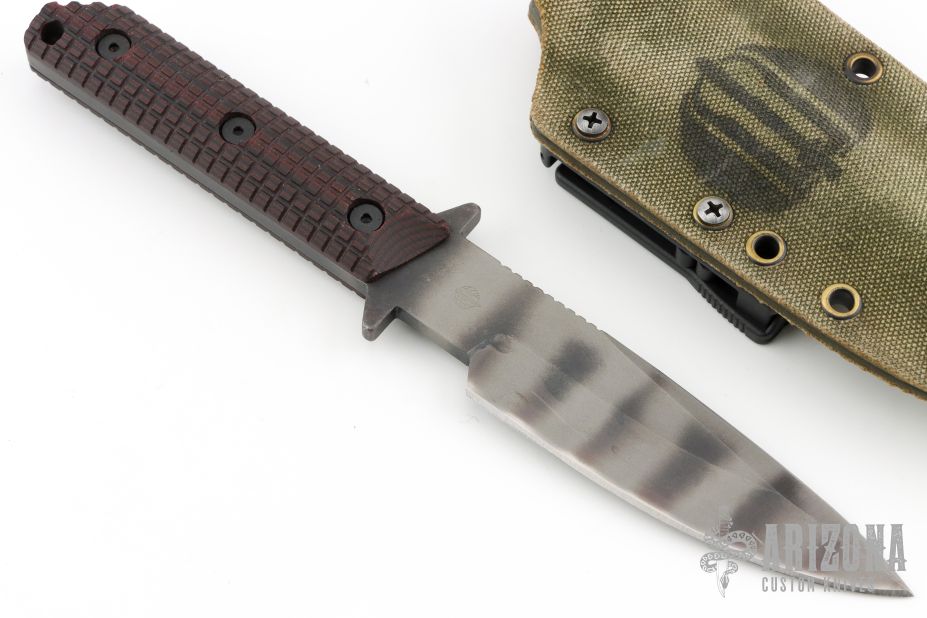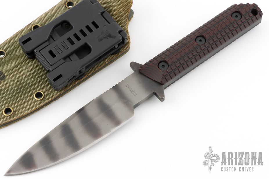 This WB fixed blade by Mick Strider features a tiger stripe finish blade with full tang construction, .245" bladestock and 1.326" blade depth. Black G10 scales with a "Frag" pattern. Notched thumb notch. Includes Kydex sheath and Strider Velcro pouch. Has some scuffs and scratches, great condition otherwise.