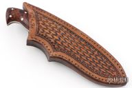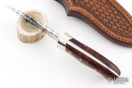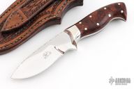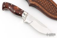 This "Chama" Skinning Knife by Jay Fisher features a mirror polished blade with fileworked spine, .191" blade stock and 1.216" blade depth, full tapered tang construction. The handle has polished nickel silver dovetailed bolsters, Honduran Rosewood Burl scales and nickel silver pins. Comes with hand tooled brown leather sheath. Has a few light scratches, has a crack in each scale, otherwise excellent condition.