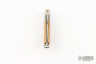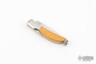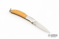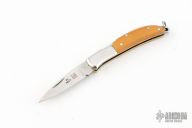 The diminutive Osprey™ an Al Mar Classic since 1979, offers timeless design and peerless craftsmanship usually found only on the finest custom hand made knives; all in the smallest, highest quality, front lock made today. The Osprey™ features a polished stainless steel blade with nail nick. The handle has stainless steel bolsters, yellow paper micarta scales, brass liners and a stainless steel backspacer with lanyard hole and a small splitring. Has some light scratches, otherwise excellent condition. 1983-1985