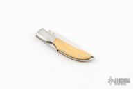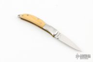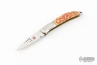 The diminutive Osprey™ an Al Mar Classic since 1979, offers timeless design and peerless craftsmanship usually found only on the finest custom hand made knives; all in the smallest, highest quality, front lock made today. The Osprey™ features a polished stainless steel blade with nail nick. The handle has stainless steel bolsters, yellow paper micarta scales with dragon scrimshaw, brass liners and a stainless steel backspacer with lanyard hole. Comes with a leather slip sheath. Has some light scratches, otherwise excellent condition. 1985-1990