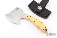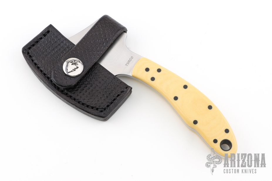 This Small Hatchet by Mickey Yurco features a satin finish blade with .181" blade stock, 2.402" blade depth, 2.5" blade length, full tang construction. The handle has yellow paper micarta scales with black pins and a lanyard hole. Comes with a hand tooled black leather sheath. Excellent condition. #4025
