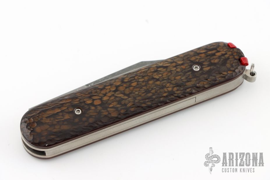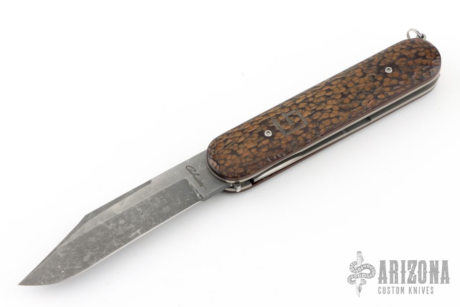 This Switch Army Switchblade by Chuck Gedraitis features an acid/tumble finished blade with false top edge. The handle has jigged vintage brown paper micarta scales, orange peel finished titanium liners and backspacer with lanyard hole. Has tweezers and toothpick like a Swiss Army Knife. Nice action, lockup and blade seating. Comes with a zippered case and COA dated '24. Has a couple very light scratches, otherwise excellent condition.