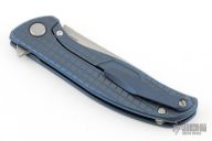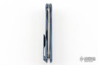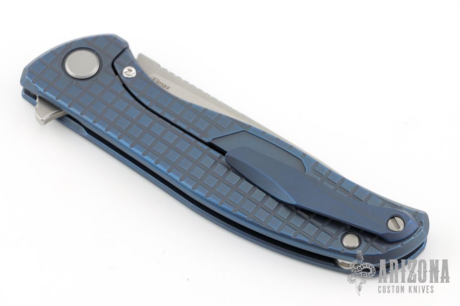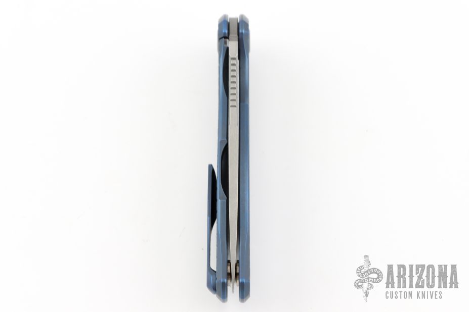 The Frame: The scales are titanium in Monkey Edge FRAG Pattern with a tumbled blue anodized finish. Machined titanium pocket clip with matching finish. Custom pivot, scale hardware and clip screw with blasted finish