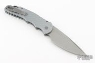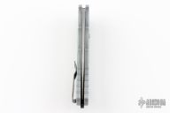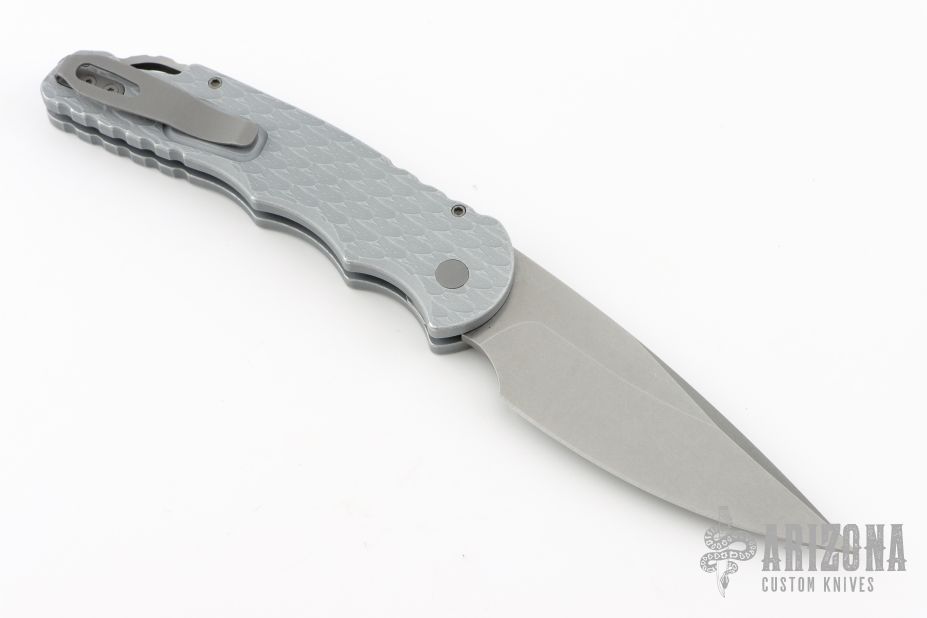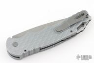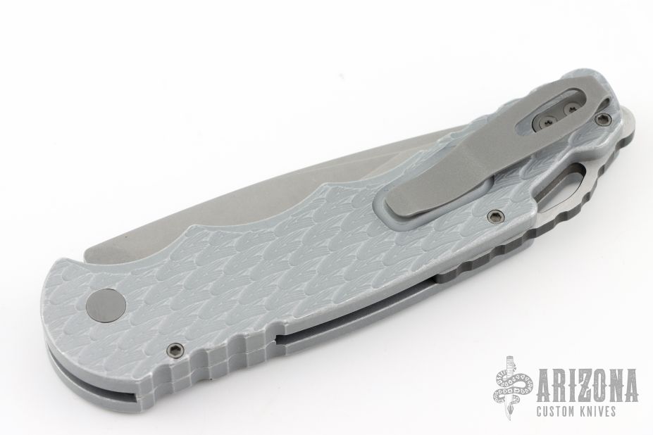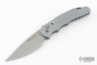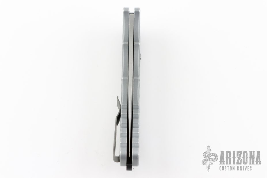 This Tactical Response 4 by Pro-Tech has a Grey blade with a plain edge, and a battle worn/feather textured aluminum handle. Bead blast finished steel clip. Steel glass breaker. Secondary safety switch. Comes with original box, pouch and papers. Has scuffs and scratches, great condition otherwise.
