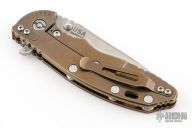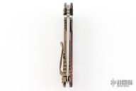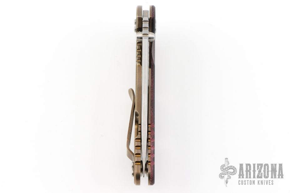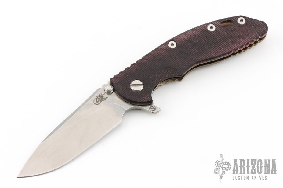 This Skinny XM-18 3.5" flipper by Rick Hinderer features a stonewashed blade with notched thumbrest and flipper. The handle has a stonewashed titanium frame with a maroon micarta scale, a tip up or down reversible titanium clip and filler tab, lanyard hole at the butt. Comes with original box, original blue g10 scale, and extra washers. Currently has Skiff bearings installed, and has a nice smooth action... Has some scuffs and scratches, great condition otherwise.