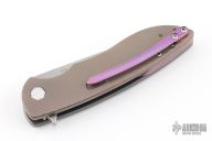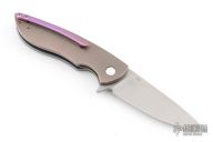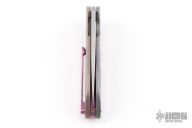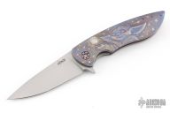 This Micro Sting Flipper by Herman Knives features a tumbled blade and flipper. The handle has a milled and tumbled titanium frame with titanium liner, tip up clip and backspacer. The front has been engraved by Micho with an image of Yoda. Nice detent, lockup and blade seating. Rides on bearings. Comes with original, box zippered case, COA dated 07/19/2022, pivot tool and extra bearings. Excellent condition.
