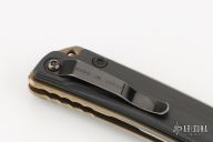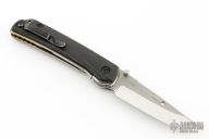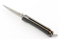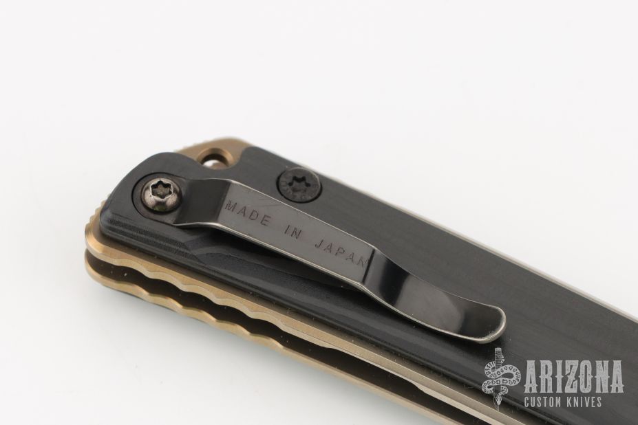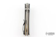 This Higo from Rockstead features a two-tone drop point blade with mirror polished grinds, dual thumb studs and notched thumbrest. The handle has carbon fiber scales over anodized titanium liners and a single barrel spacer. Lanyard hole in pommel. Includes original box and papers. Has some scuffs and scratches, great condition otherwise.