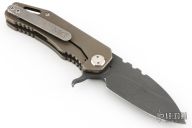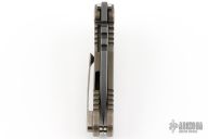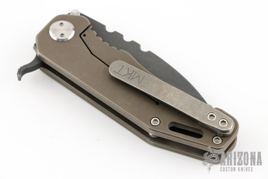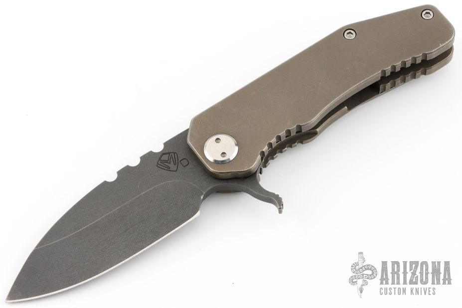 This 187F by Medford Knife and Tool features a PVD coated drop point blade with notched thumbrest and flipper. The handle has a tumbled titanium frame and tip up titanium clip.  Nice detent, lockup and blade seating. Comes in a zipper case. Has a few light scuffs, otherwise excellent condition.