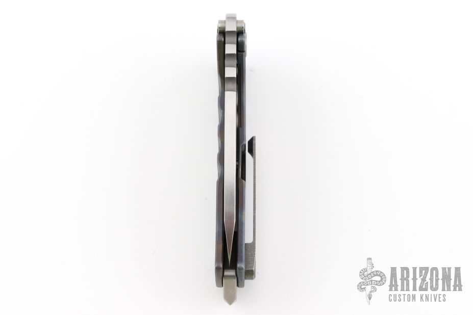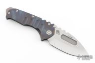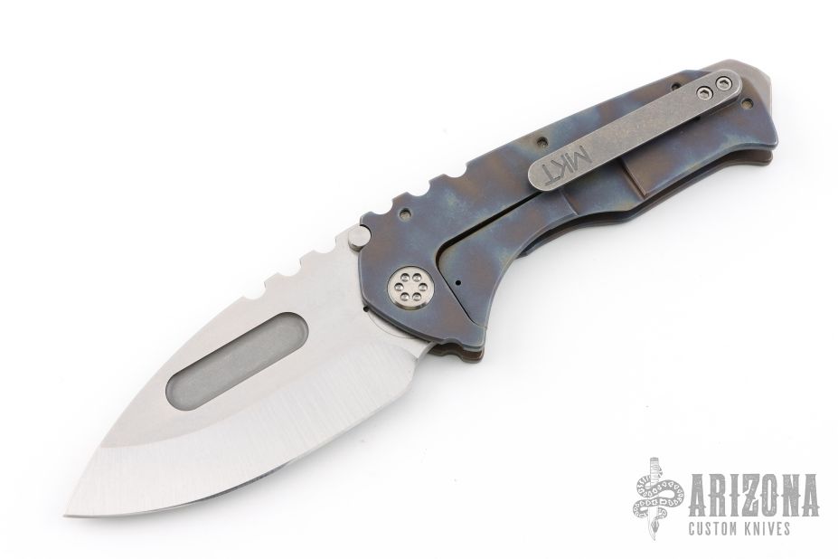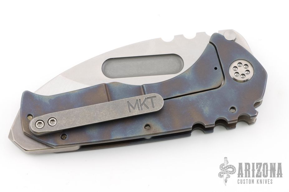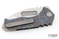 This Praetorian T by Medford Knife and Tool features a stonewash finished blade with fullers and notched thumbrest. The handle has a tumbled and anodized titanium frame with a titanium tip up pocket clip and a D2 backspacer/glass breaker with lanyard bail.  Includes original hard case and COA dated 12-4-2017. Excellent condition.