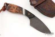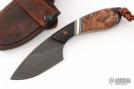 This Skalpr by Vorn Knives features a drop point blade with an acid stonewashed finish, .151" blade stock and 1.361" blade depth, full tang construction. The handle has ironwood bolsters, salted maple burl scales with black liners, black/white/bone spacers. Comes with original box, COA and hand tooled brown leather sheath. Excellent condition.