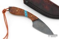 This Skalpr by Vorn Knives features a drop point blade with an acid stonewashed finish, .144" blade stock and 1.396" blade depth, full tang construction. The handle has ironwood scales with black liners, black/white/turquoise spacers. Comes with original box, COA and hand tooled brown leather sheath. Excellent condition.4.2