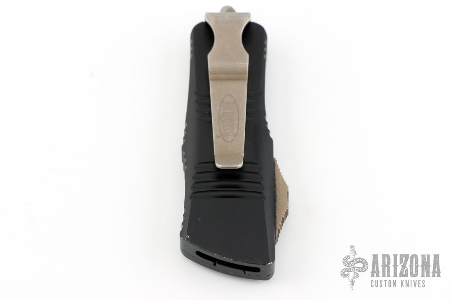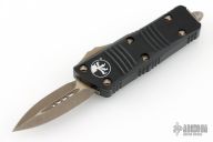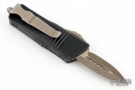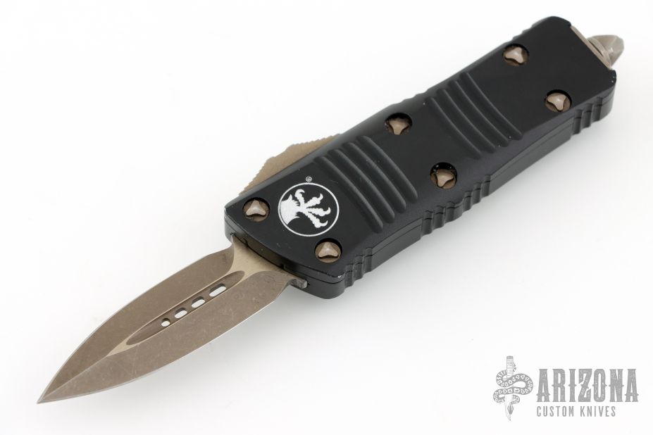 This Troodon Mini OTF automatic by Microtech knives features a bronzed double edged blade, and a black aluminum handle with bead blasted hardware, tip down carry. Glass breaker. S/N 3997. Dated 01/2022. Has a couple light scuffs, otherwise excellent condition.