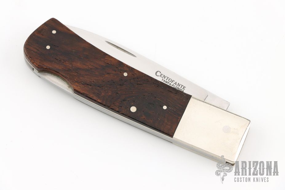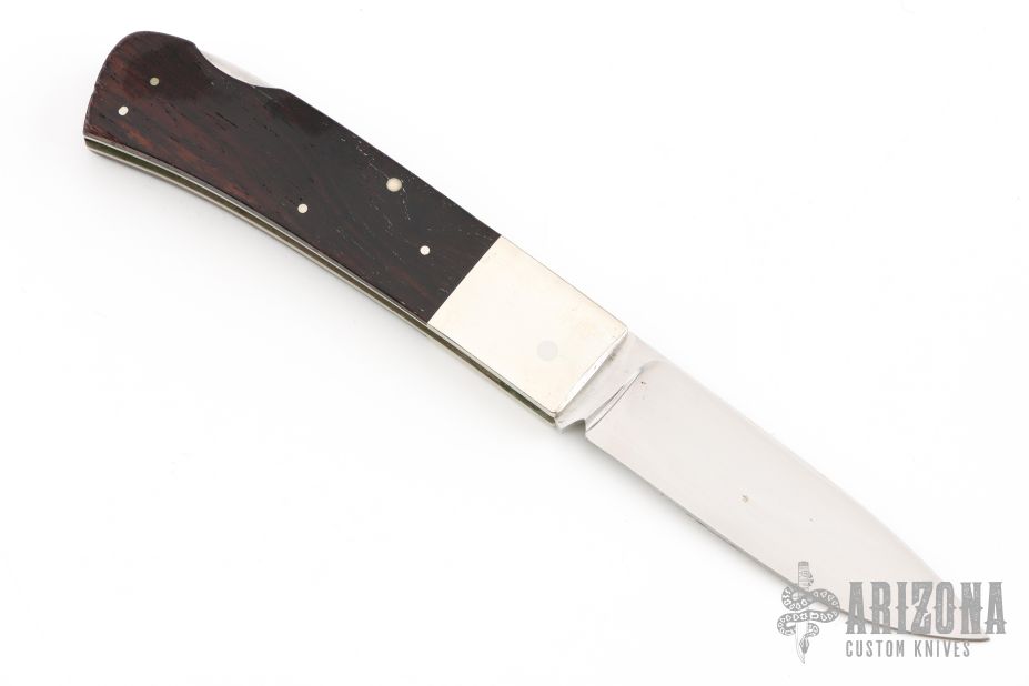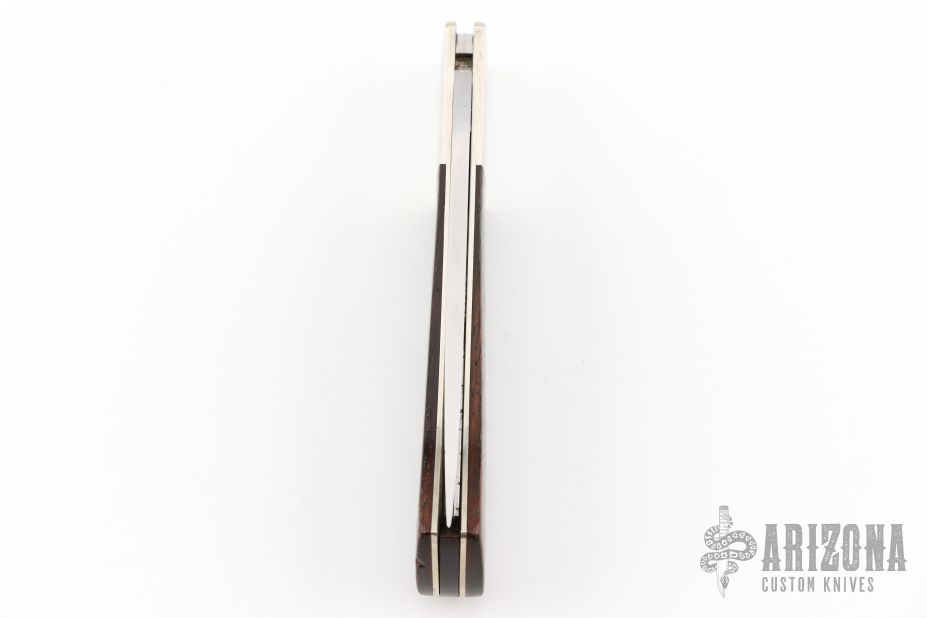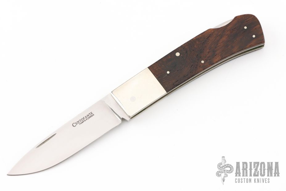 This Lockback Folder from Frank Centofante features a hand rub satin finished blade with nail nick. The handle has nickel silver bolsters, rosewood scales, nickel silver liners and stainless steel lockbar. Numbered 020 inside backspacer. Has some scratches, otherwise good condition.