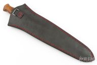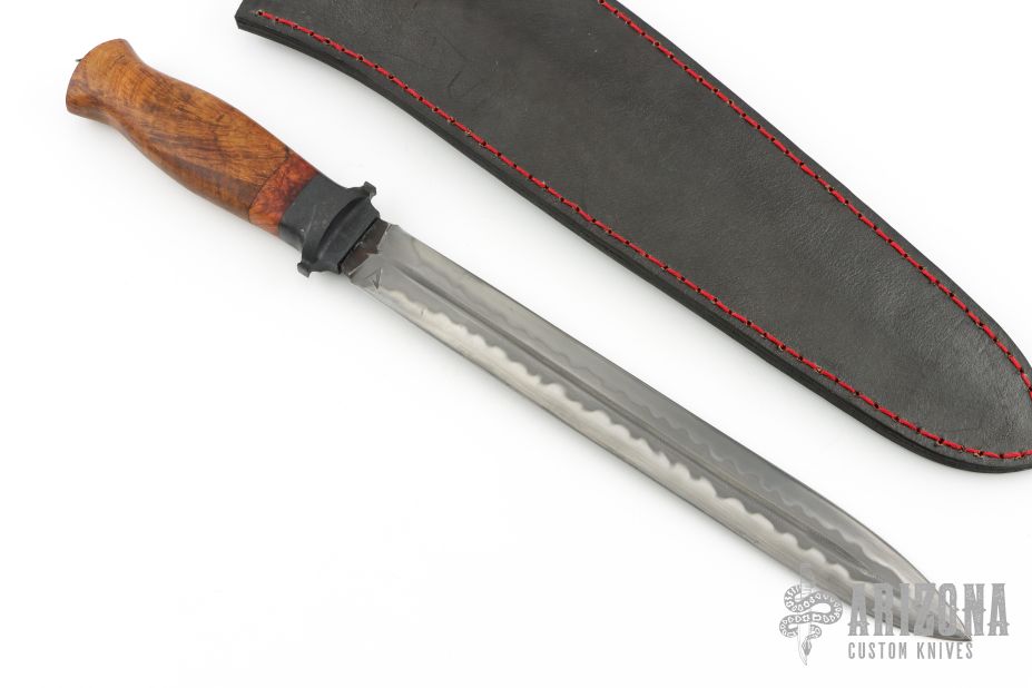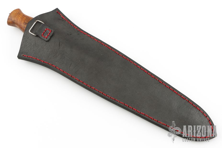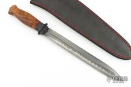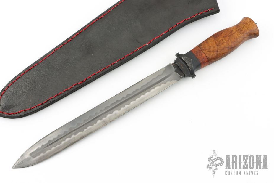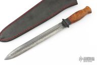 This Takedown Dagger by Last Knives features hand rub satin finished double edged blade with nice hamon, .181" blade stock and 1.100" blade depth, hidden takedown tang construction. The handle has a black mild steel guard with a teak burl grip. Comes with a black leather sheath and COA. New from maker.