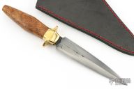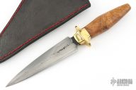 This TwinDagger by Last Knives features hand rub satin finished double edged blade with nice hamon, .204" blade stock and 1.367" blade depth, hidden tang construction. The handle has a brass guard with a teak burl grip. Comes with a leather sheath and COA. New from maker.