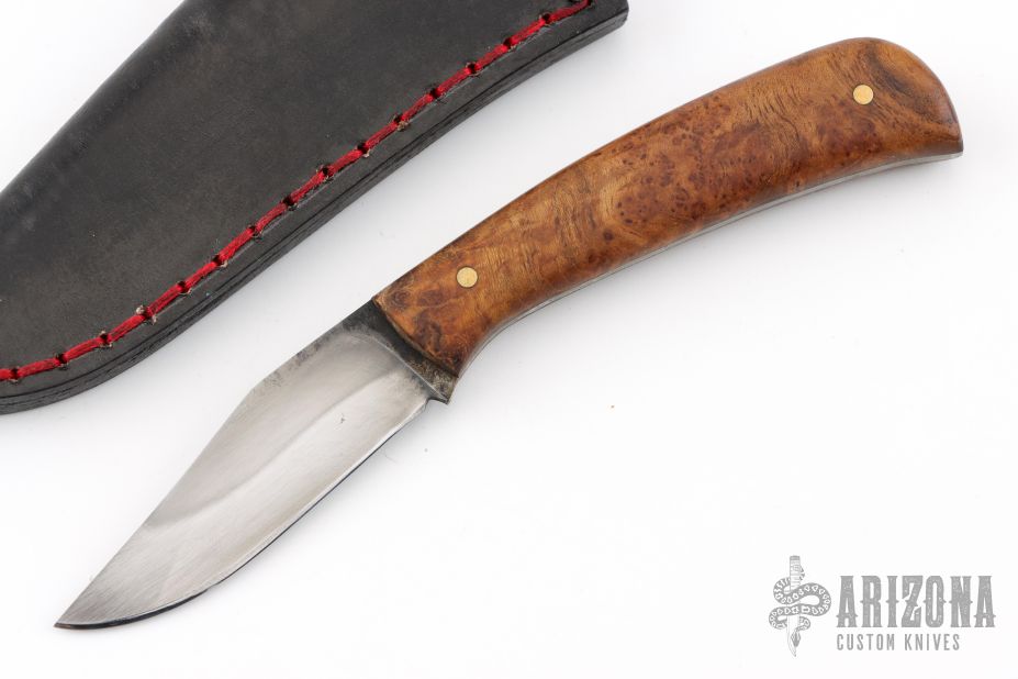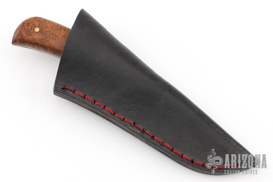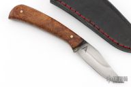 This Fixed Lanny's Clip by Last Knives features a hand rub satin finished blade with a nice hamon, .100" blade stock and .751" blade depth, full tang construction. The handle has teak burl scales with brass pins. Comes with a black leather sheath and COA. New from maker.