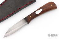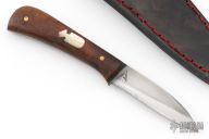 This Fixed Zulu Spear by Last Knives features a hand rub satin finished blade with a nice hamon, .087" blade stock and .635" blade depth, full tang construction. The handle has teak burl scales with brass pins and mother of pearl escutcheons. Comes with a black leather sheath and COA. New from maker.