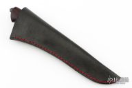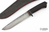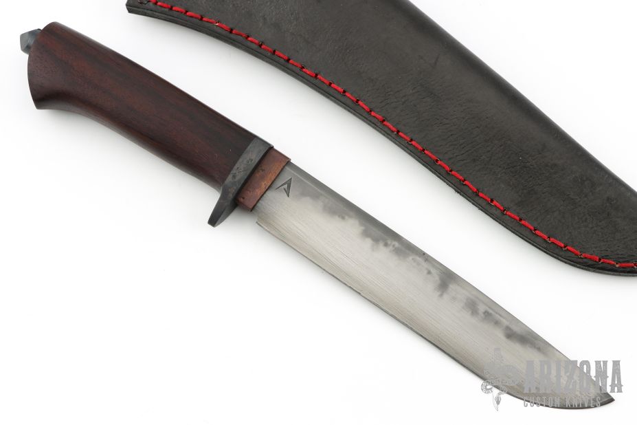 This Takedown Hunter by Last Knives features a hand forged hand rub satin finished blade with a nice hamon, .181" blade stock and 1.141" blade depth, hidden takedown tang construction. The handle has a copper habiki and a wrought iron guard, rosewood grip with a black mild steel tang nut. Comes with a leather sheath and COA. New from maker.