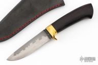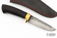 This Hunter by Last Knives features a hand forged hand rub satin finished blade with a nice hamon, .192" blade stock and 1.054" blade depth, hidden tang construction. The handle has a brass guard and a rosewood grip. Comes with a black leather sheath and COA. New from maker.