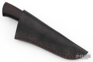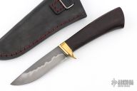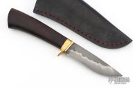 This Hunter by Last Knives features a hand forged hand rub satin finished blade with a nice hamon, .174" blade stock and .931" blade depth, hidden tang construction. The handle has a brass guard and a rosewood grip. Comes with a black leather sheath and COA. New from maker.