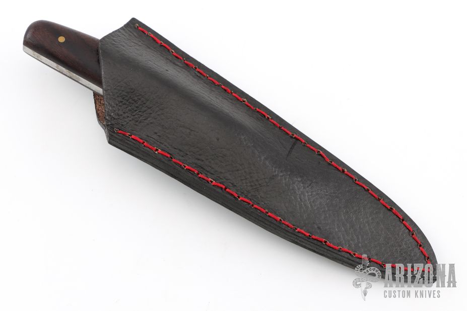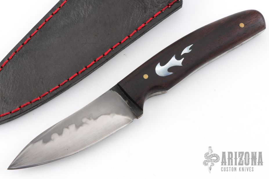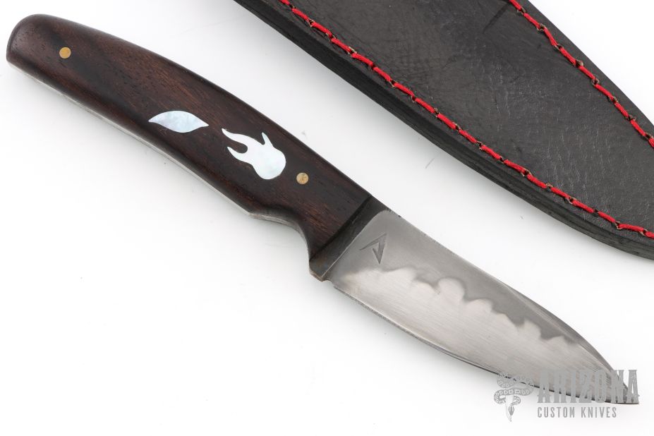 This Rikimaru by Last Knives features a hand rub satin finished blade with a visible temper line, .181" blade stock and 1.014" blade depth, full tang construction. The handle has rosewood scales with brass pins and mother of pearl escutcheons. Comes with a black leather sheath and COA. New from maker.