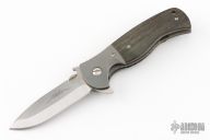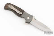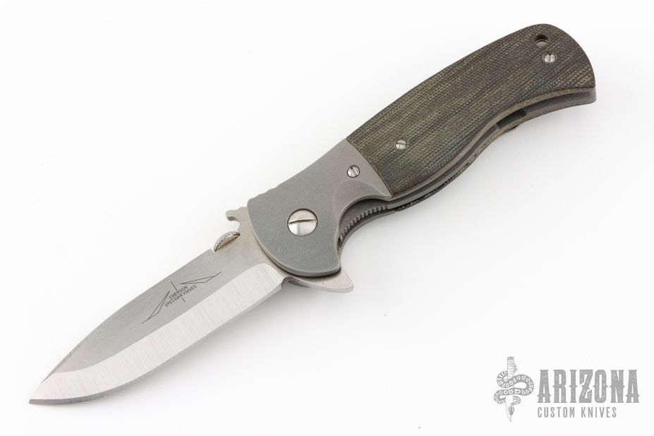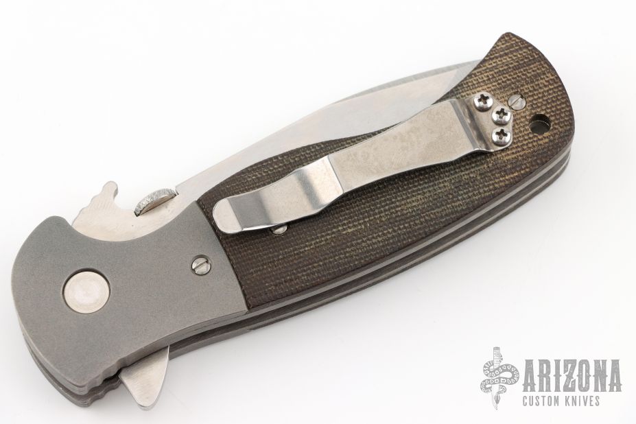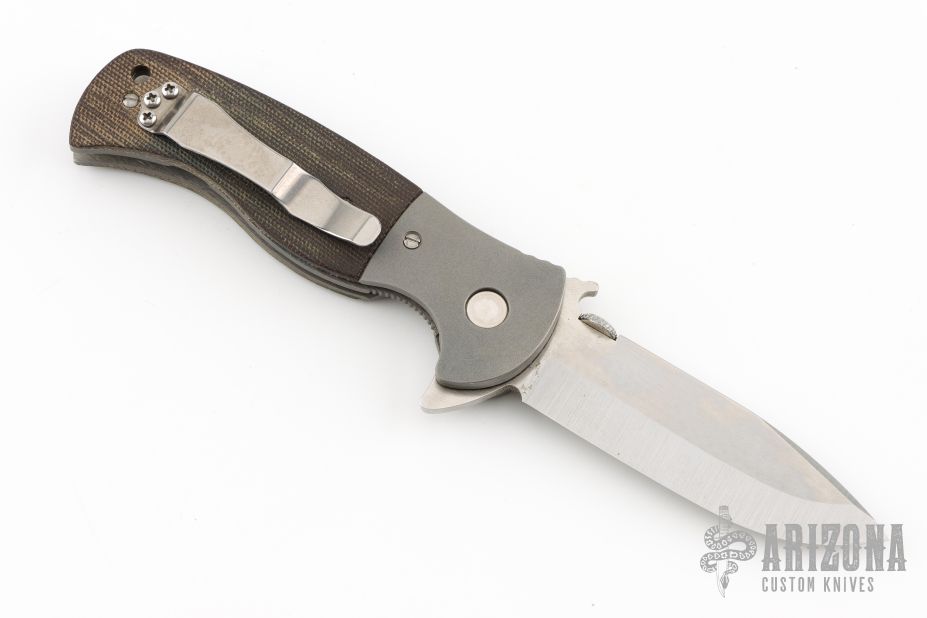 This Sheepdog by Ernie Emerson features a stonewashed blade with satin grinds, flipper tab, thumbdisc, and wave feature. The handle is comprised of bead blast finish titanium bolsters, green micarta scales over titanium liners with matching barrel spacers and tumble stainless steel tip up pocket clip. Nice action, detent and blade seating. Has scuffs and scratches throughout, great condition otherwise.