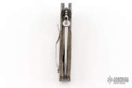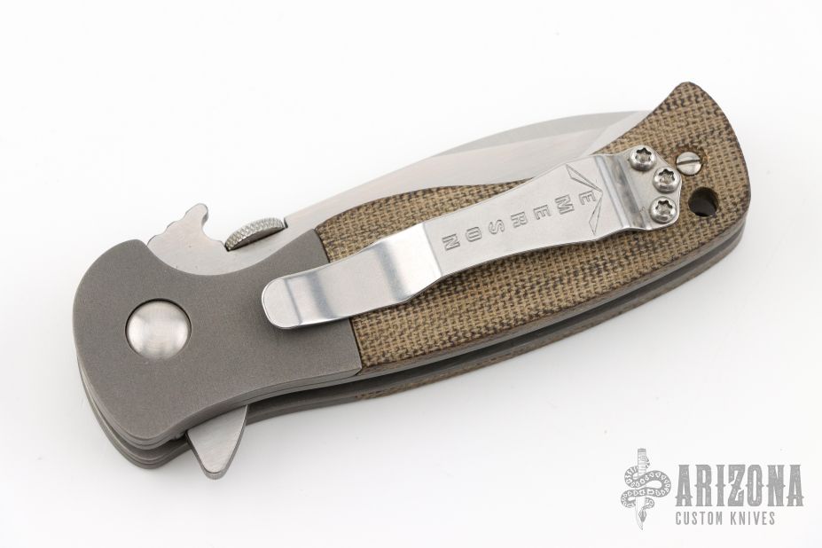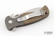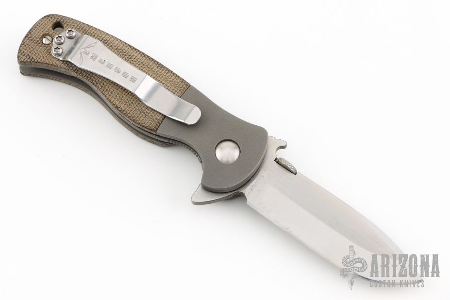 This Custom Mini Sheepdog by Ernie Emerson features a satin finished blade with flipper tab, thumbdisc, notched thumbrest and wave feature. The handle is comprised of bead blasted and dovetailed titanium bolsters, green canvas micarta scales over titanium liners with matching barrel spacers and tumble stainless steel tip up pocket clip. Nice action, detent and blade seating. Includes original box. Has been resharpened, has scratches and scuffs, otherwise good condition. We have been told this is the one and only mini sheepdog custom.