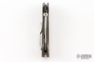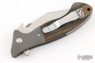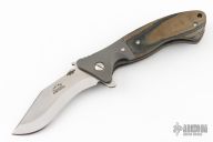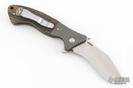 This MX-200 by Lucas Emerson features a satin finished recurve blade thumbdisc, wave and notched thumbrest, flipper. The handle has micarta scales, titanium liners, stainless steel tip up clip. Comes with original box and papers. Nice detent, lockup and blade seating. Comes in original box. Has some light scuffs, excellent condition otherwise.