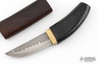 This Kwaiken by Last Knives features a hand forged hand rub satin finished blade with a nice hamon, .198" blade stock and 1.046" blade depth, hidden tang construction. The handle has a brass habiki and a buffalo horn grip. Comes with a rosewood sheath and COA. New from maker.