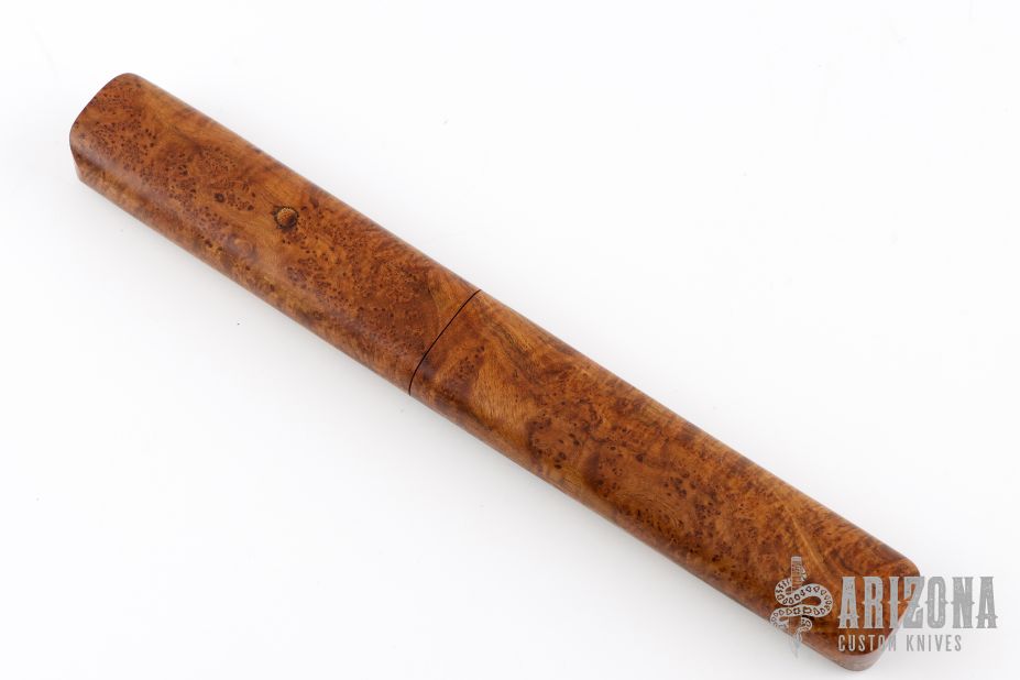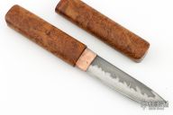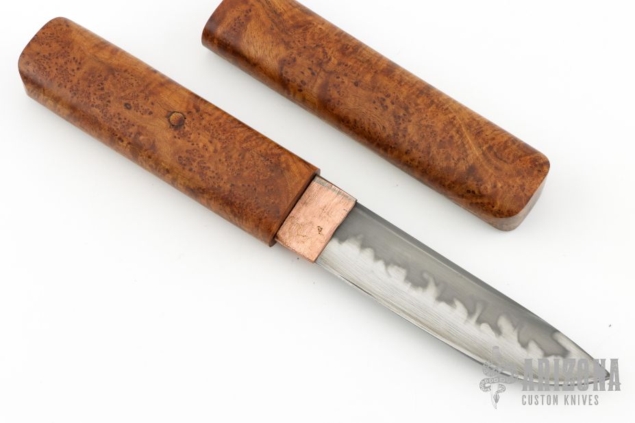 This Knockdown Kwaiken by Last Knives features a hand forged hand rub satin finished blade with a nice hamon, .175" blade stock and 1.051" blade depth, hidden tang construction. The handle has a copper habiki and a Teak burl wood grip. Comes with a matching Teak wood sheath and COA. New from maker.