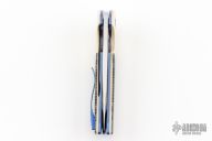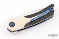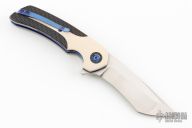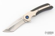 This Void flipper by Les Voorhies features a satin finished tanto recurve blade with false top edge and a flipper. The handle has paper micarta covers with C-Tek overlays and pivot collars, anodized titanium liners, floating titanium backspacer and tip up anodized titanium clip. Comes with a COA. Rides on bearings. Has a couple light scratches, otherwise excellent condition.