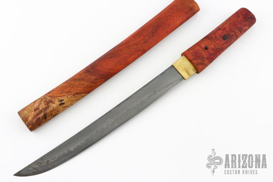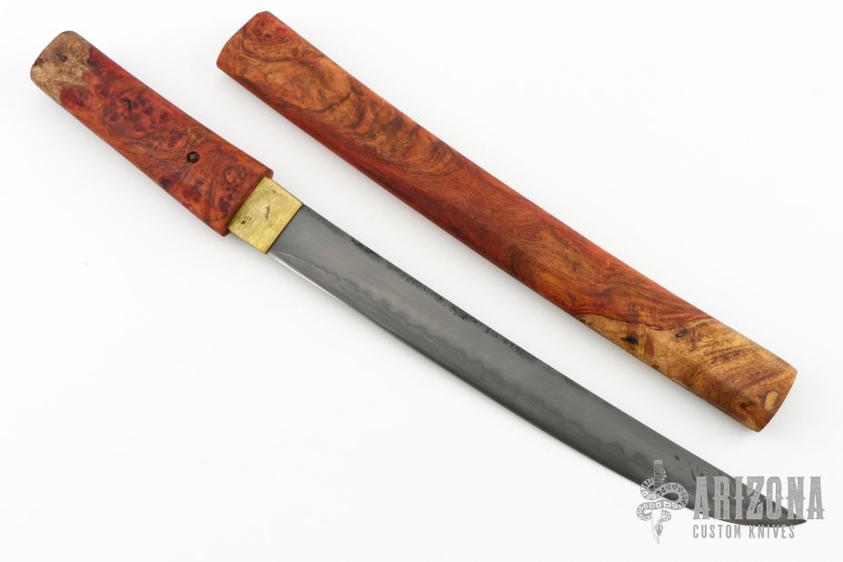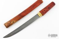 This Shirayasa Tanto by Last Knives features a hand forged hand rub satin finished blade with a nice hamon, .233" blade stock and 1.155" blade depth, hidden tang construction. The handle has a brass habiki and red amboyna burl grip. Comes with a matching red amboyna burl wood sheath and COA. New from maker.