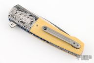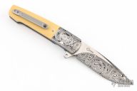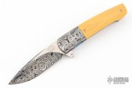 This LL07 linerlock flipper by Herucus Blomerus features a Grosserosen Damasteel blade with polished flats and flipper. The handle has matching Damastel bolsters, paper micarta scales with anodized, file worked titanium liners, Damasteel backspacer and a tip up milled titanium clip with ceramic ball insert. Blade is centered when closed, nice detent and lockup. Very smooth flipping action, rides on Ceramic IKBS. Comes with COA dated 10/11/17. Has a couple light scratches, excellent condition otherwise.