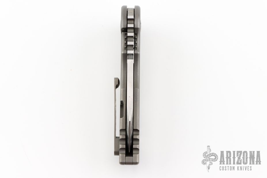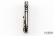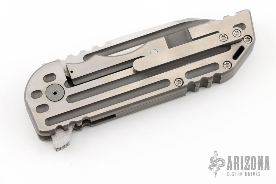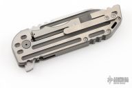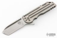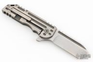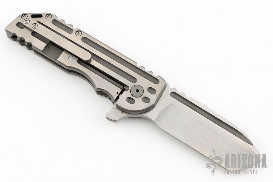 This Warhorse features a hand rub satin finished blade with fullers that opens/closes effortlessly on caged bearings. The handle is titanium with a satin finished tip up clip and an acid tumbled titanium backspacer. The blade is centered when closed and locks up with no play. Comes in a Bharucha Design zipper case. Has a couple light scratches, has some rust spots, has some light scuffs, great condition otherwise.