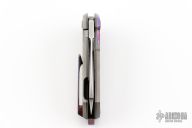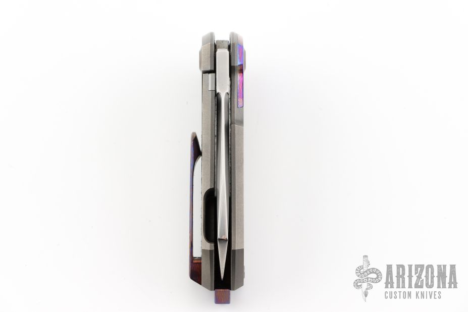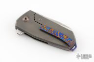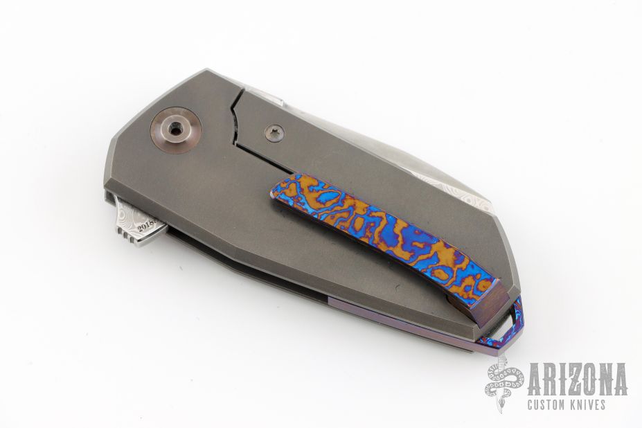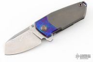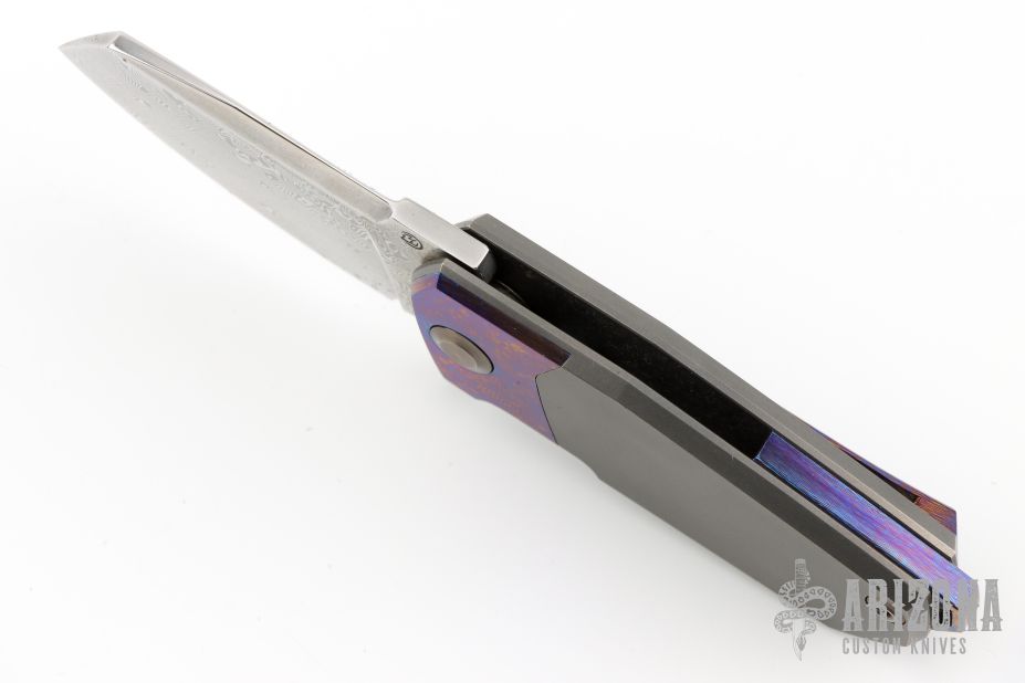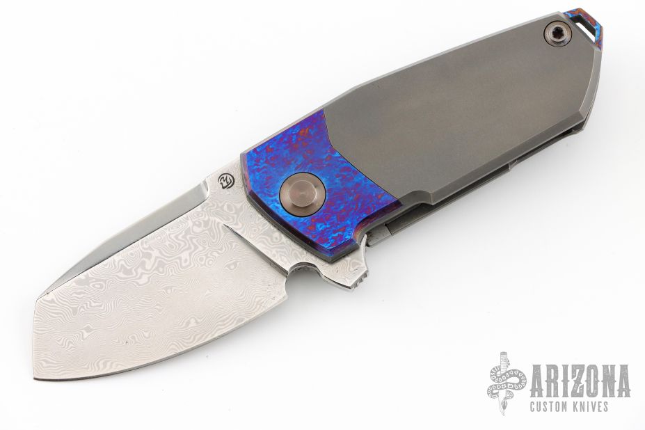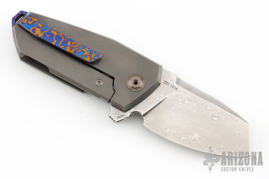 This Bulldog flipper by Alexander Churburkov features a Zladinox ZDI-1016 Damascus Steel blade with notched flipper. The handle has an anodized titanium frame with inlaid timascus bolsters, backspacer with lanyard hole and tip up clip with hidden screws. Has stainless lockface insert, rides on bearings, nice detent, lockup and blade seating. Comes with a zippered case and COA. Dated 2018. Has a couple light scuffs, otherwise Excellent condition.
