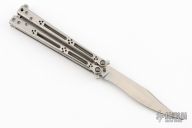 This Basilisk R Ti from HOM Design features a satin finished recurve clip point 154 CM blade with swedge. The handle is comprised of satin finished titanium scales over stainless steel backspacers, tip up titanium clip, comes with steel and titanium T latch. Includes original box and COA. Has some scuffs and scratches, great condition.